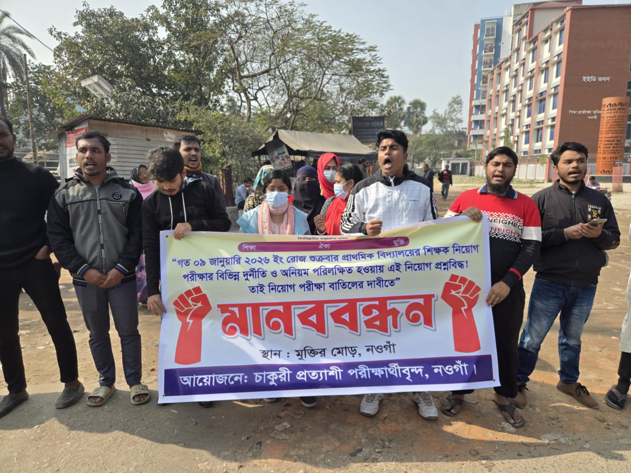 নওগাঁয় সহকারী শিক্ষক নিয়োগ পরীক্ষা বাতিলের দাবীতে মানববন্ধন